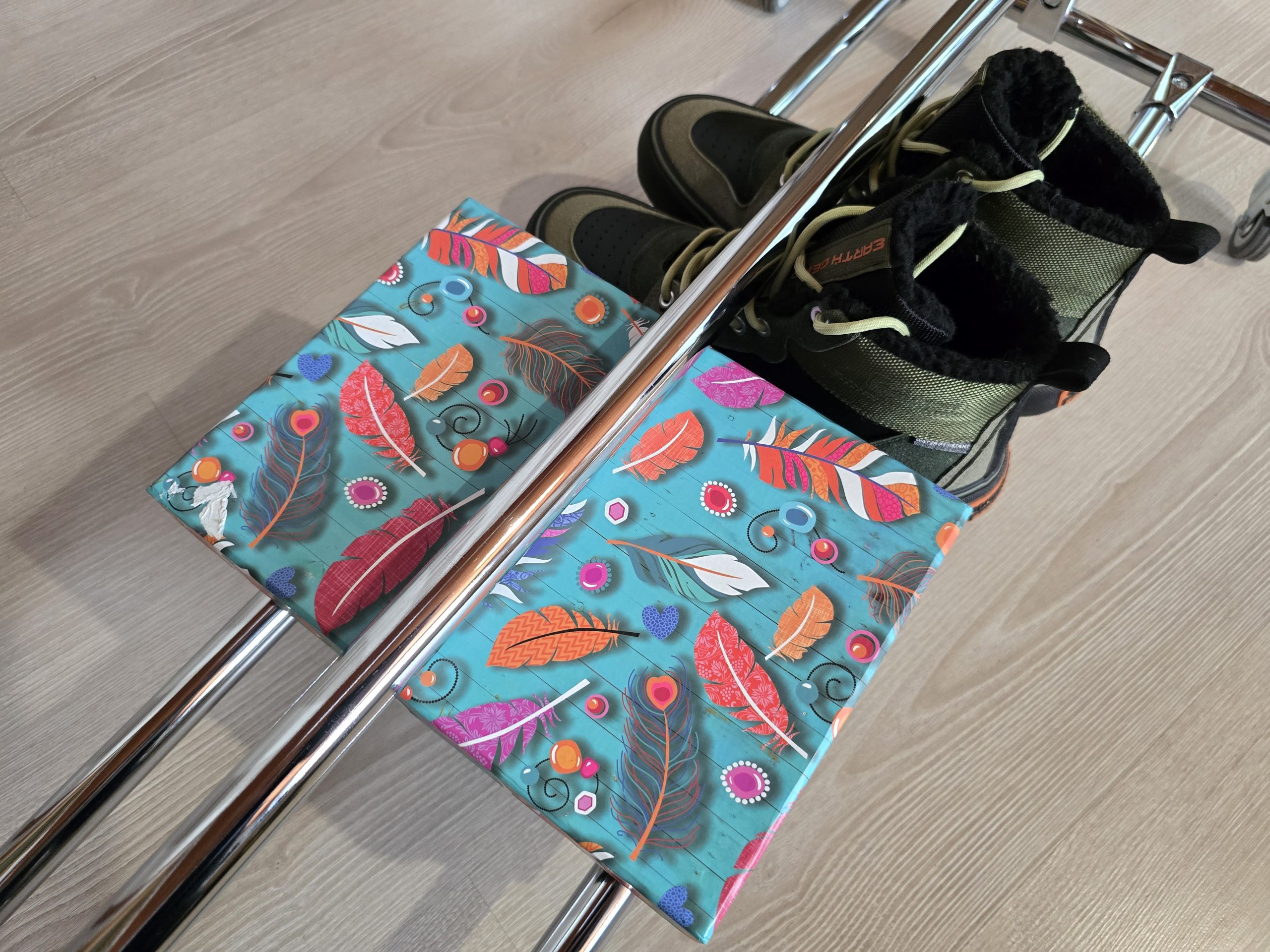 2 drążki na dole stojaka które służą jako półka na obuwie lub kartony z butami czy pudełka na akcesoria odzieżowe.